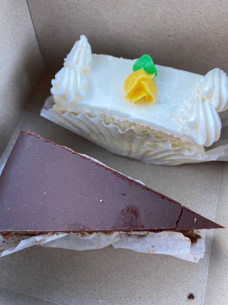 (") this cake, a.k.a. "pie," is famous for two layers of vanilla sponge cake, plenty of bavarian filling and topped with chocolate ganache.